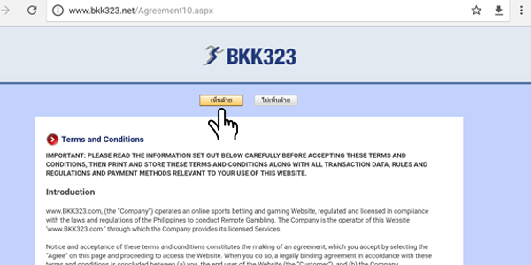 ขั้นตอนที่ 2 จากนั้นคลิ๊กที่ปุ่ม เห็นด้วย เพื่อยอมรับข้อตกลงเงื่อนไขในการเล่น Bkk323 บีเคเค323 |