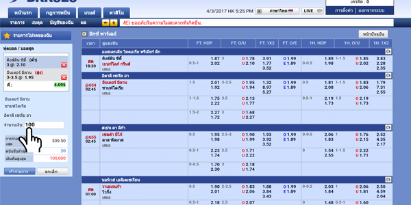 ขั้นตอนที่ 4 เมื่อท่านเลือกแทงบอลชุด หรือบอลเสต็ป Bkk323 บีเคเค323 ได้แล้ว ให้ท่านใส่ยอดเงินที่จะวางพนันเดิมพัน แทงบอล bkk323 ได้เลย ( บอลชุด หรือบอลเสต็ป แทงขึ้นต่ำ 2 คู่ขึ้นไป ) |