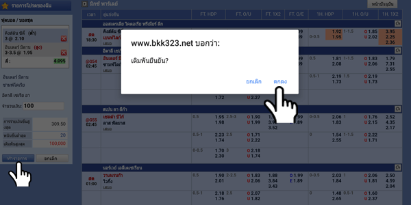 ขั้นตอนที่ 5 ให้ท่านคลิก ทำรายการ และคลิก ตกลง ตามภาพ เท่านี้ก็เสร็จสำหรับขั้นตอนเล่น แทงบอล ออนไลน์ Bkk323 บีเคเค323 บนมือถือ หรือ แท็บเล็ต |
